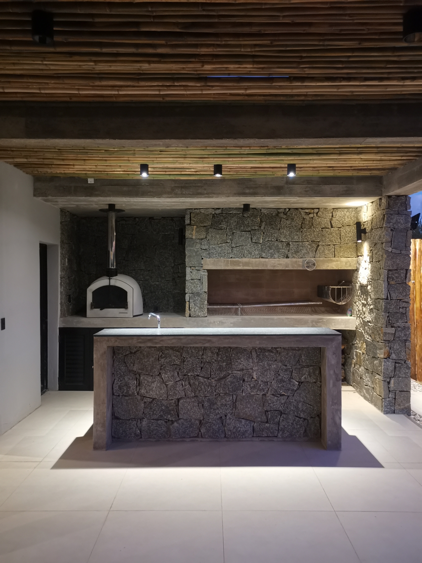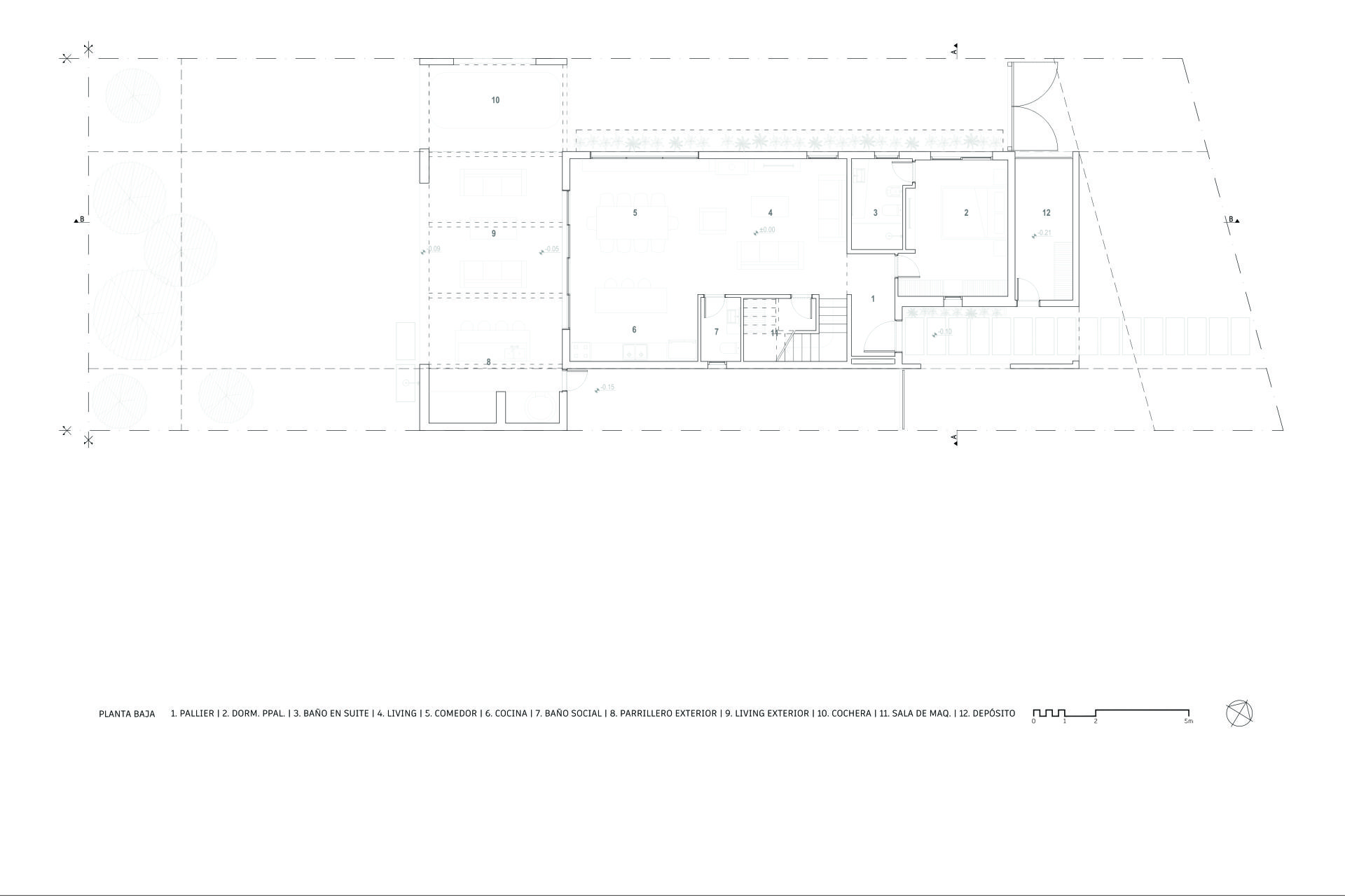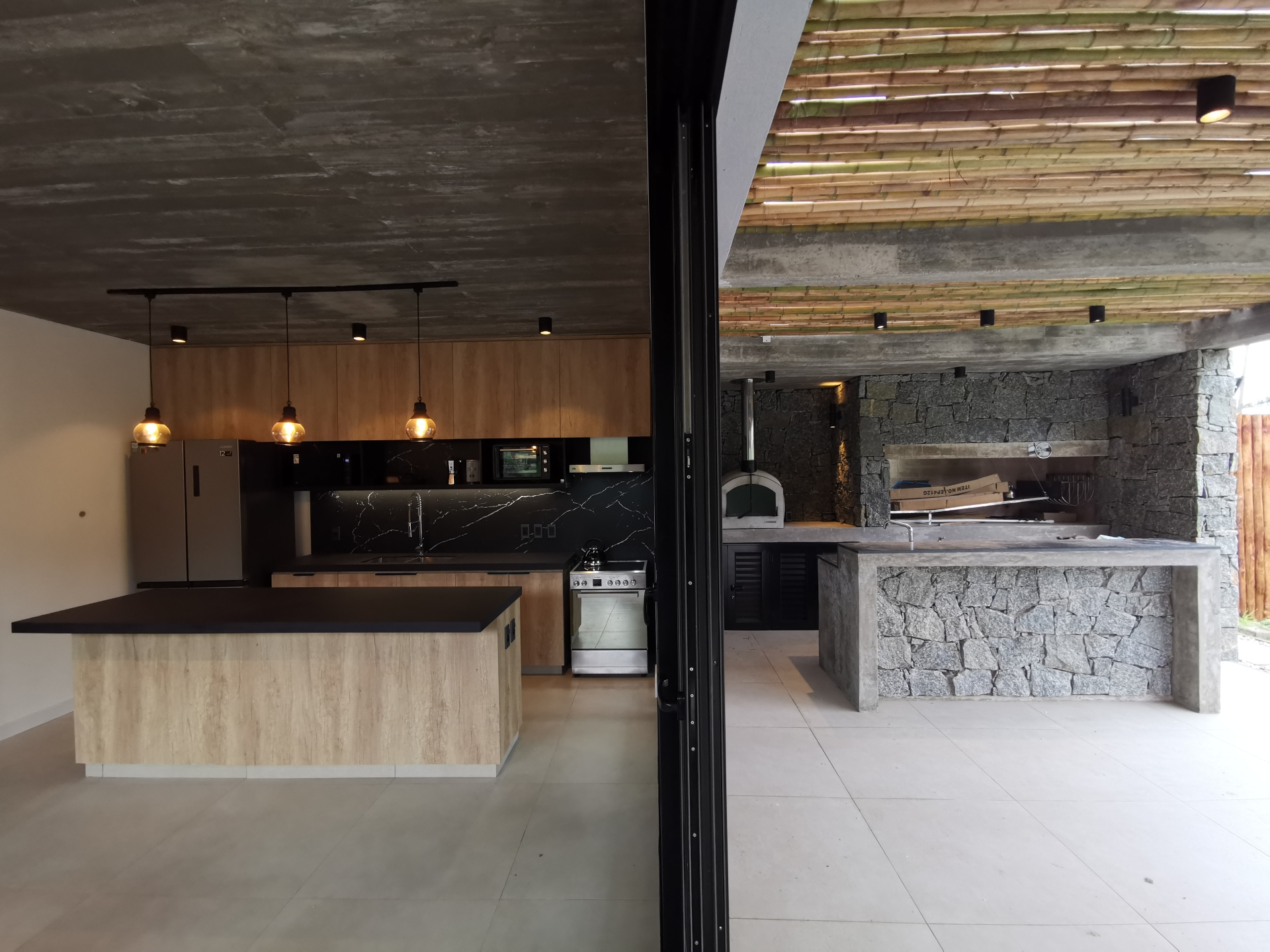 En planta baja los espacios de mayor jerarquía son; living y cocina / comedor. Estando estos últimos dos vinculados completamente al exterior donde se ubica una zona techada con parrillero y horno de barro, a continuación de este se encuentra el patio de la vivienda.