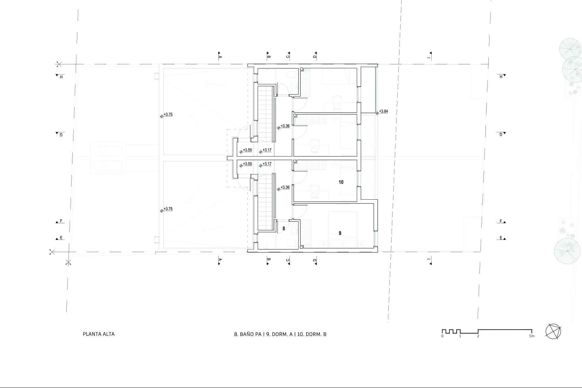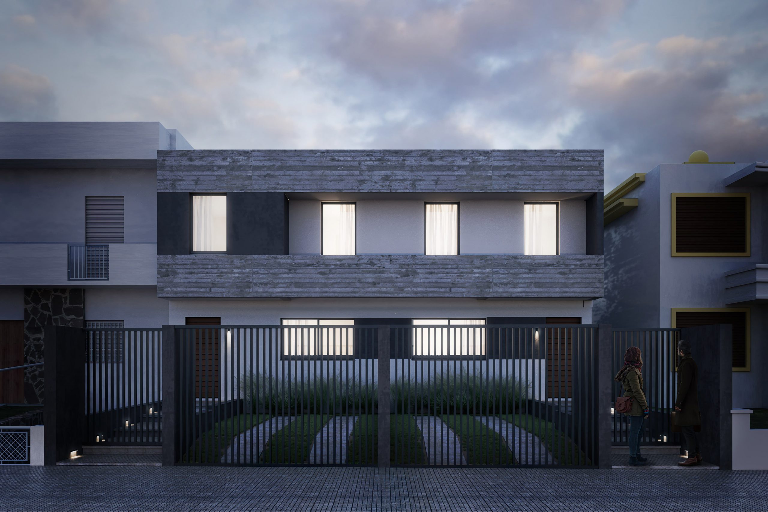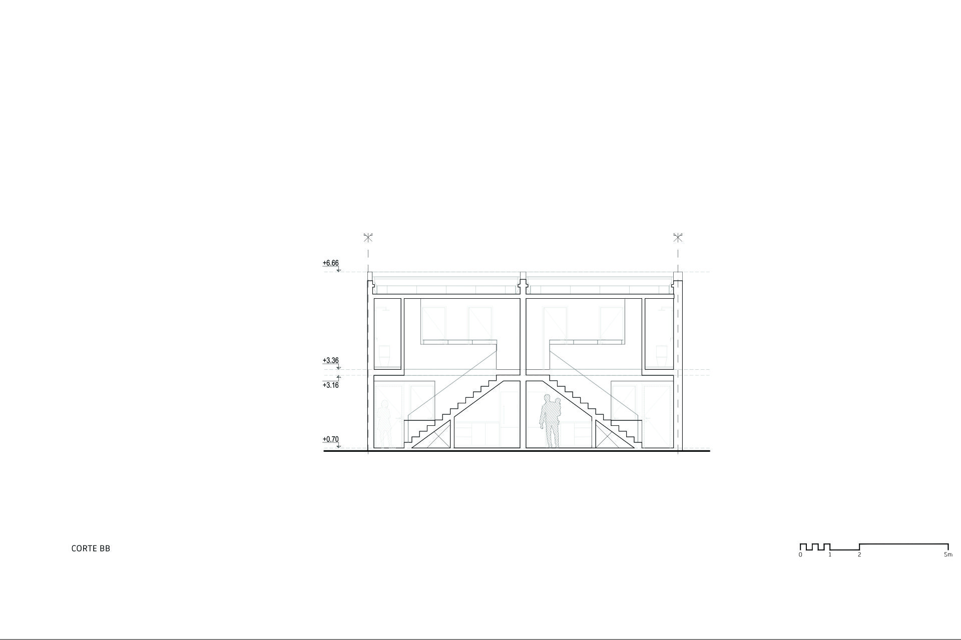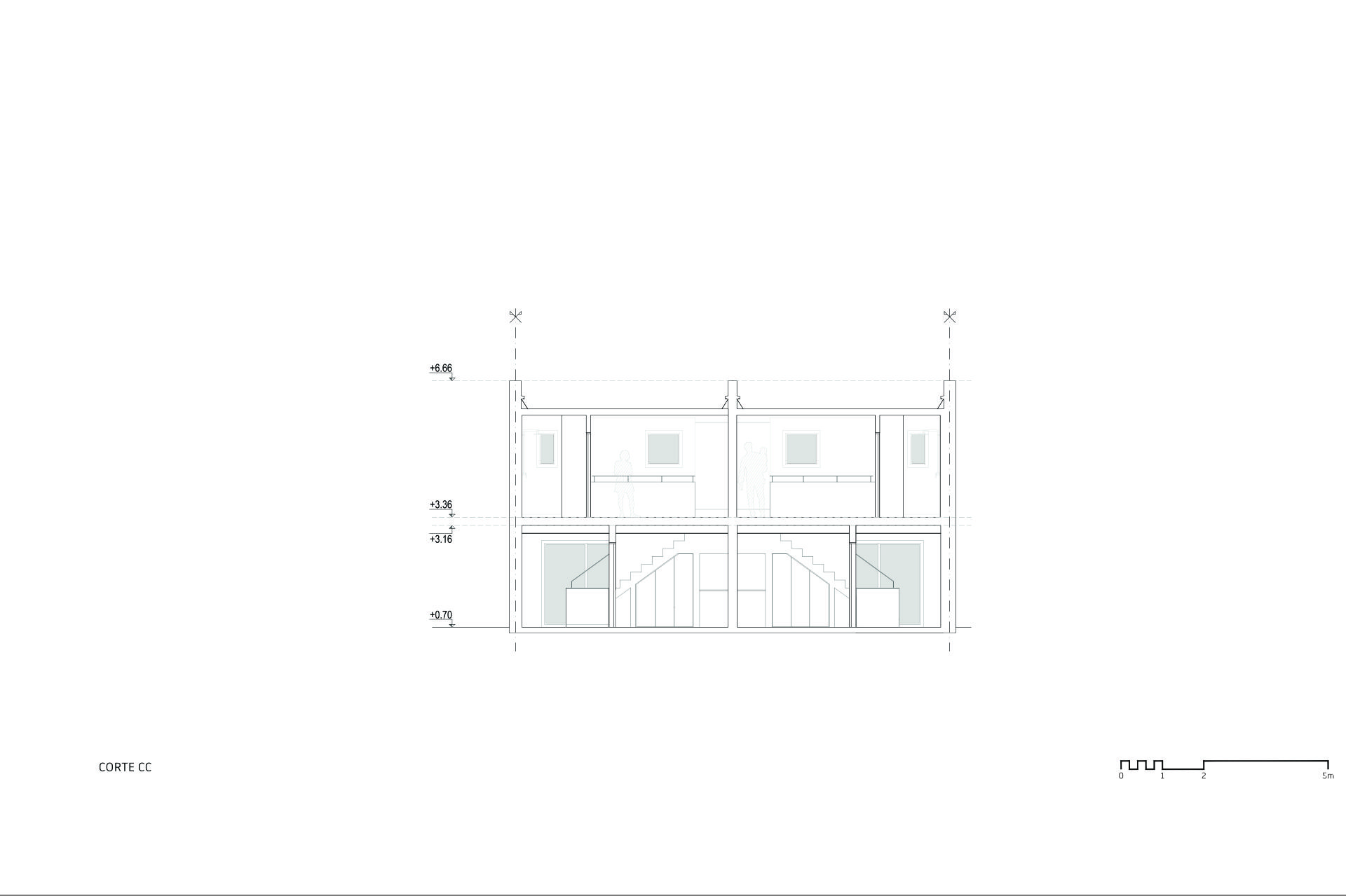 Vivienda de Interés Social, que se desarrolla en dos plantas, articulando dos unidades, ambas de 3 dormitorios. En planta baja se organizan el living / comedor asociados al parrillero ubicado en el fondo del predio, cocina, baño y dormitorio principal. Hacia el frente del terreno se resuelve el acceso techado y cochera. En planta alta se disponen los dos dormitorios restantes y baño. Adelantando una posible ampliación a futuro, se realizan las previsiones necesarias para poder conformar un cuarto dormitorio en planta alta.