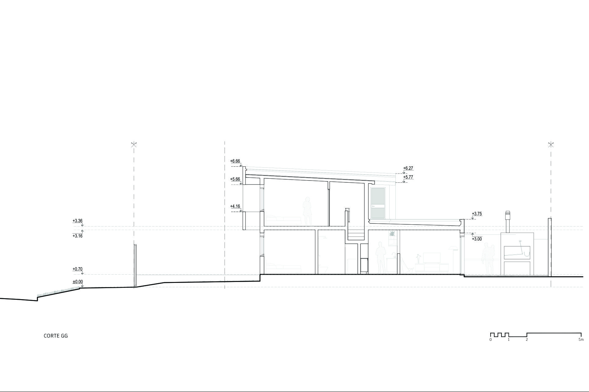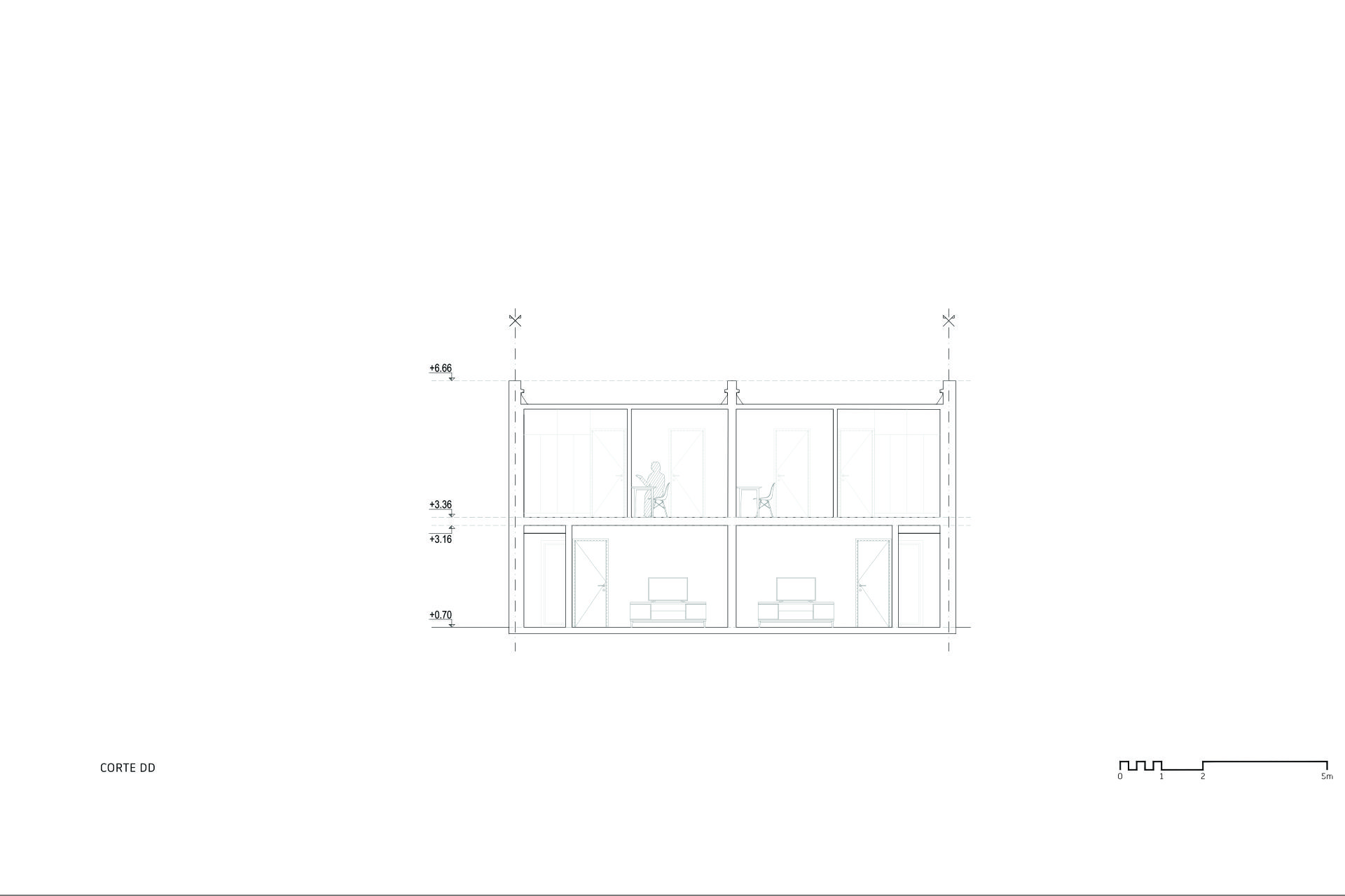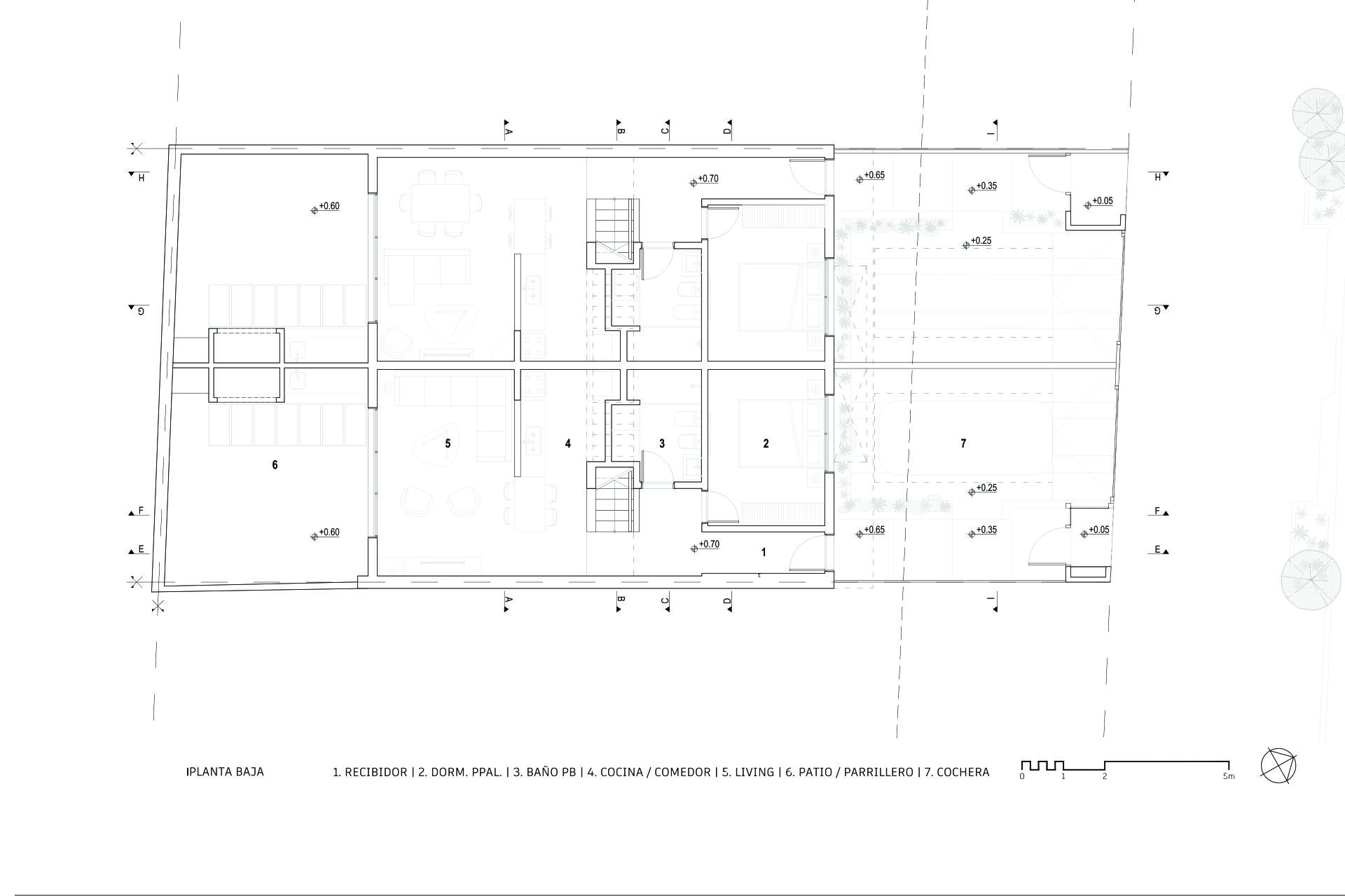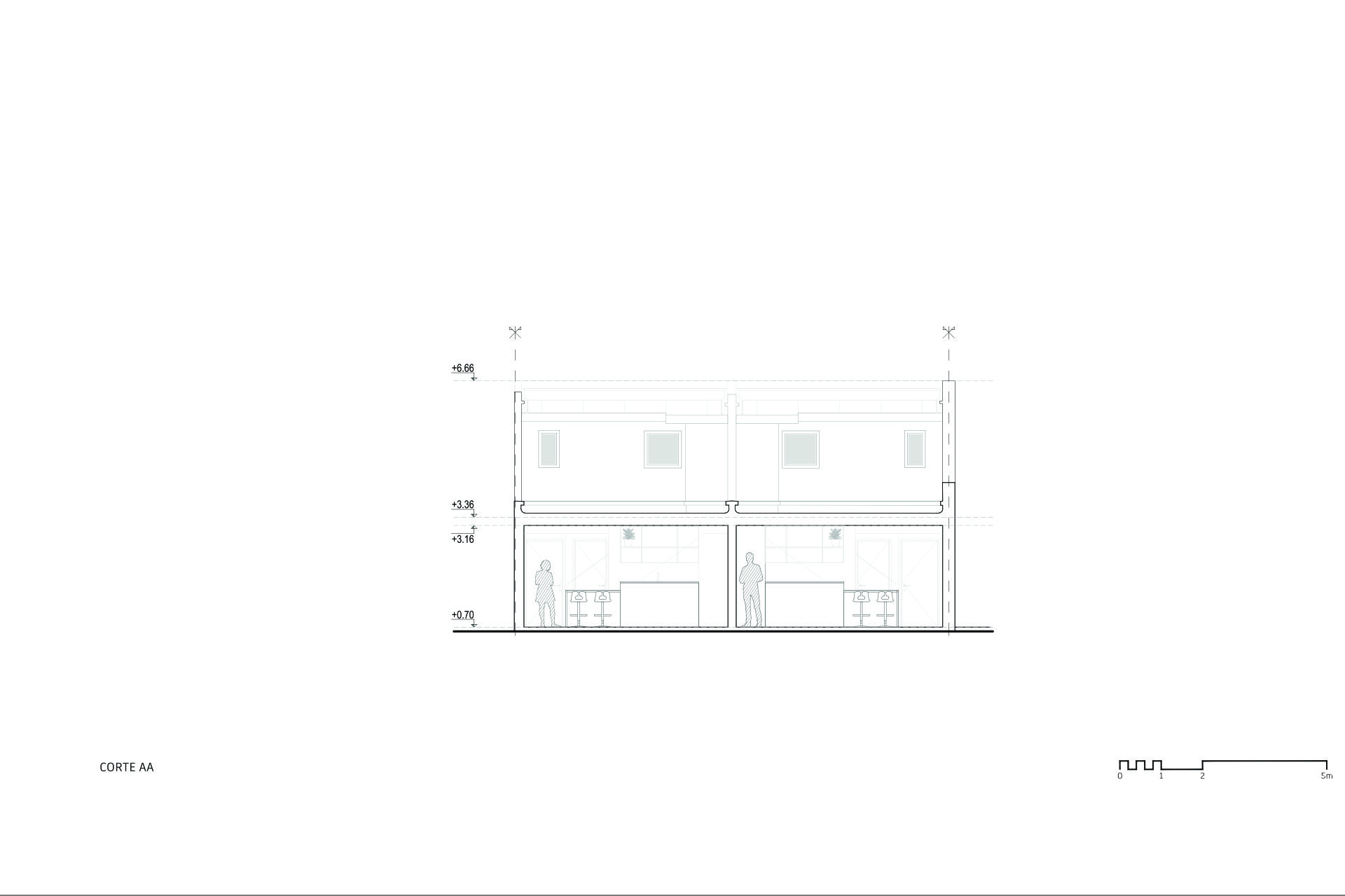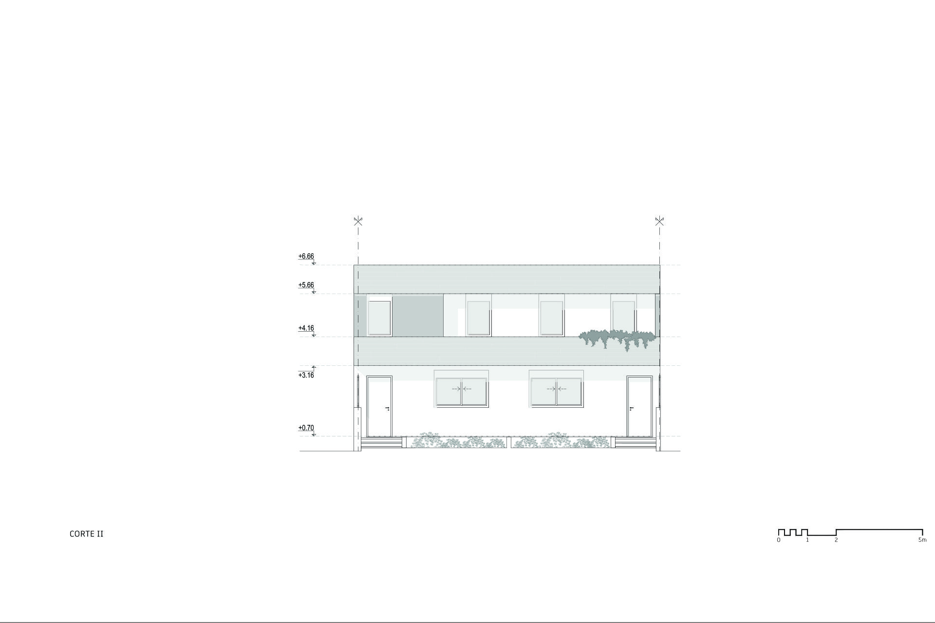 Vivienda de Interés Social, que se desarrolla en dos plantas, articulando dos unidades, ambas de 3 dormitorios. En planta baja se organizan el living / comedor asociados al parrillero ubicado en el fondo del predio, cocina, baño y dormitorio principal. Hacia el frente del terreno se resuelve el acceso techado y cochera. En planta alta se disponen los dos dormitorios restantes y baño. Adelantando una posible ampliación a futuro, se realizan las previsiones necesarias para poder conformar un cuarto dormitorio en planta alta.